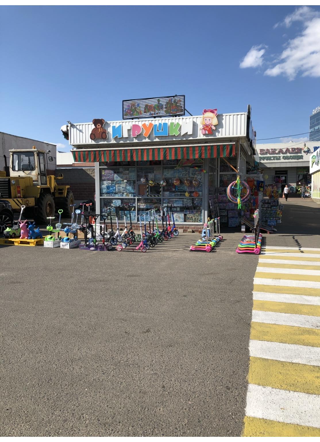 Два павильона стоят друг за другом, площадью 23 и 25 метров, с огромными витринными окнами, четырьмя входами и окошками-кассами. Большой диодный экран, направленный на центральный вход на рынок.